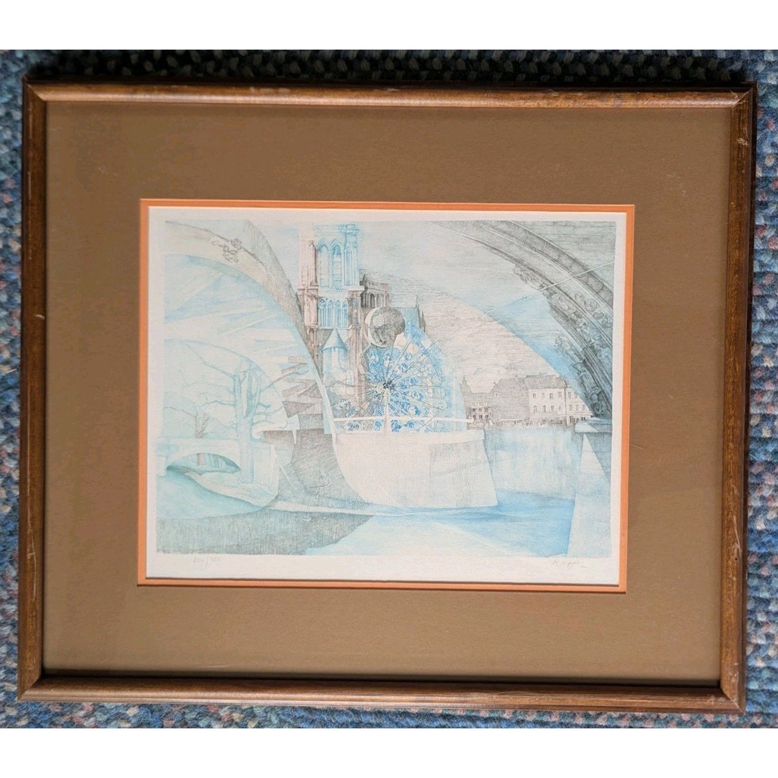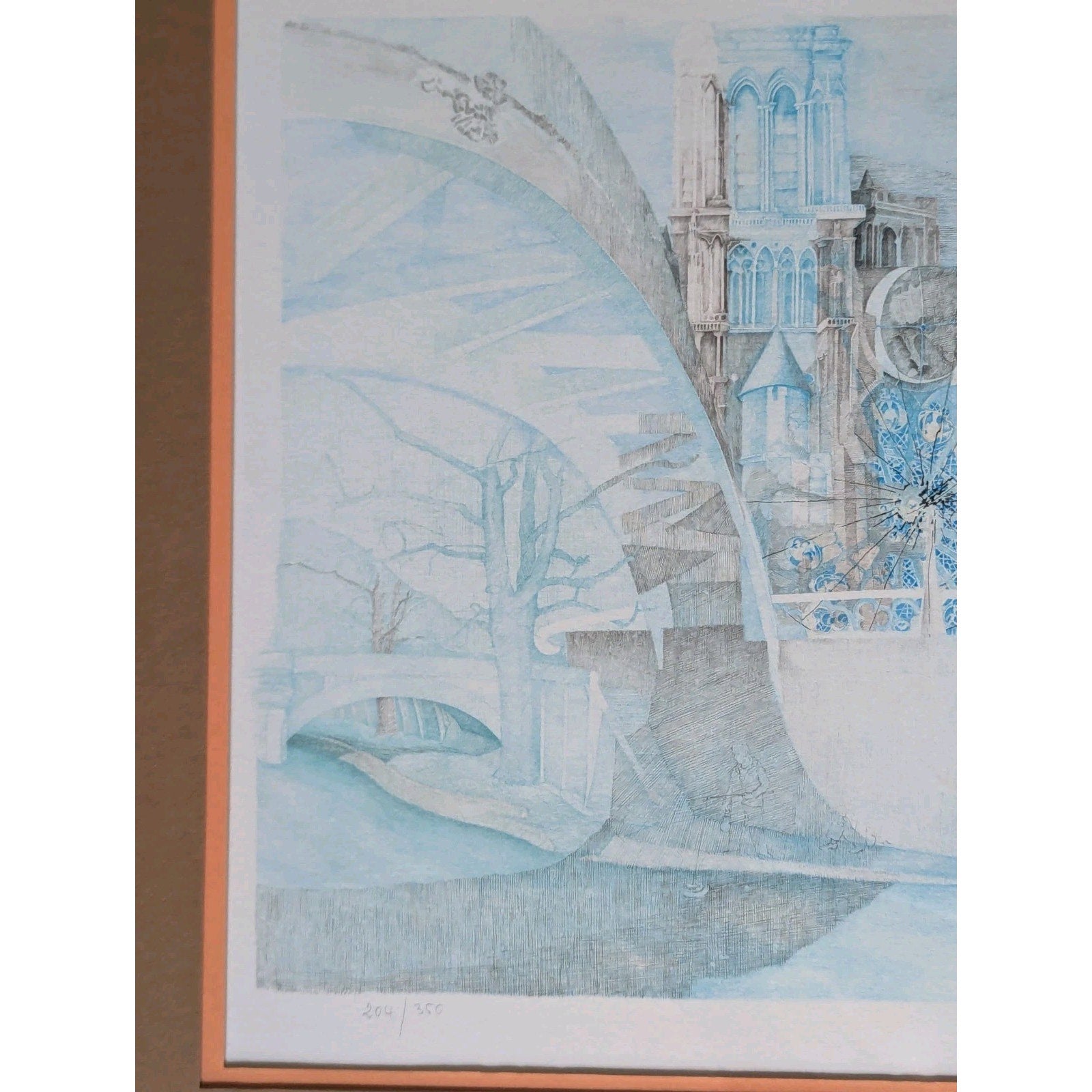 This piece features an intricate architectural composition with cathedral-like elements, executed in Krajnc’s distinctive, airy blue and gray palette. The lithograph is professionally matted and framed.