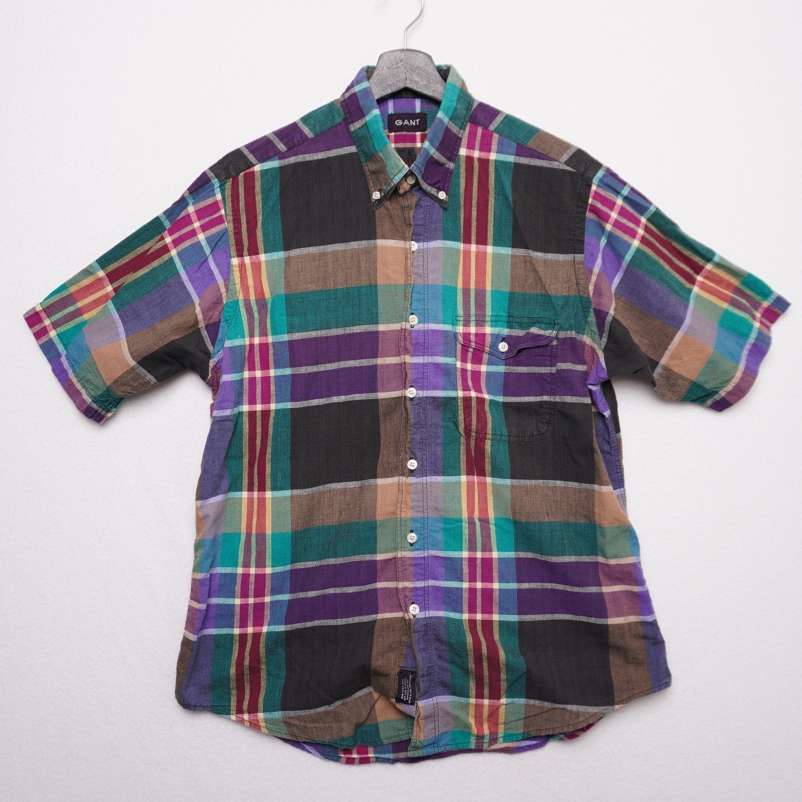 Great vintage shirt -- an authentic Indian Madras plaid shirt by Gant in a bold multicolor pattern in green, purple, black, tan, and burgundy.