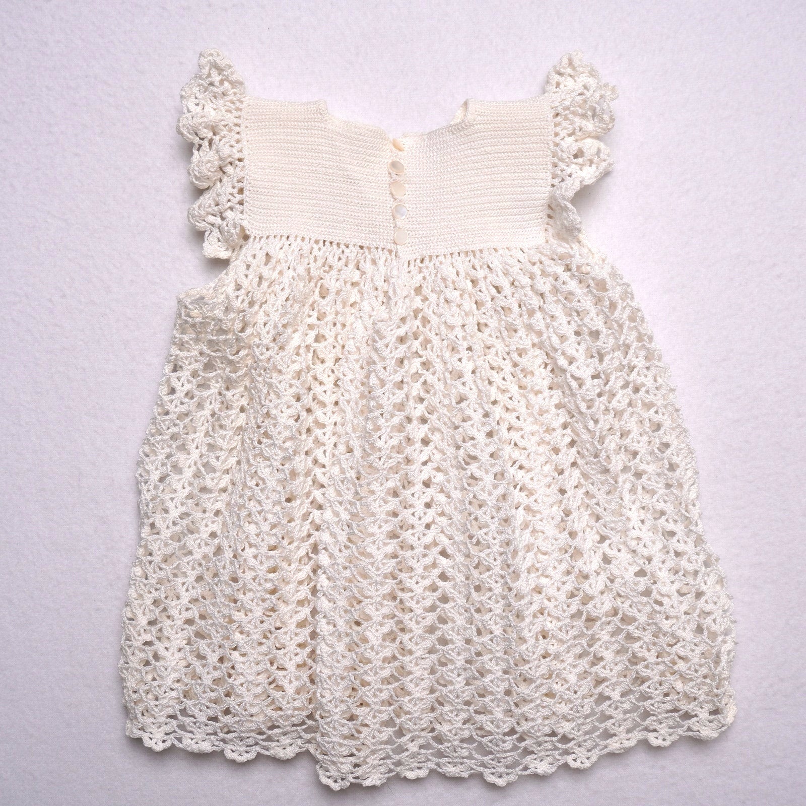 Beautiful handmade vintage baby dress with intricate ivory crochet knit design