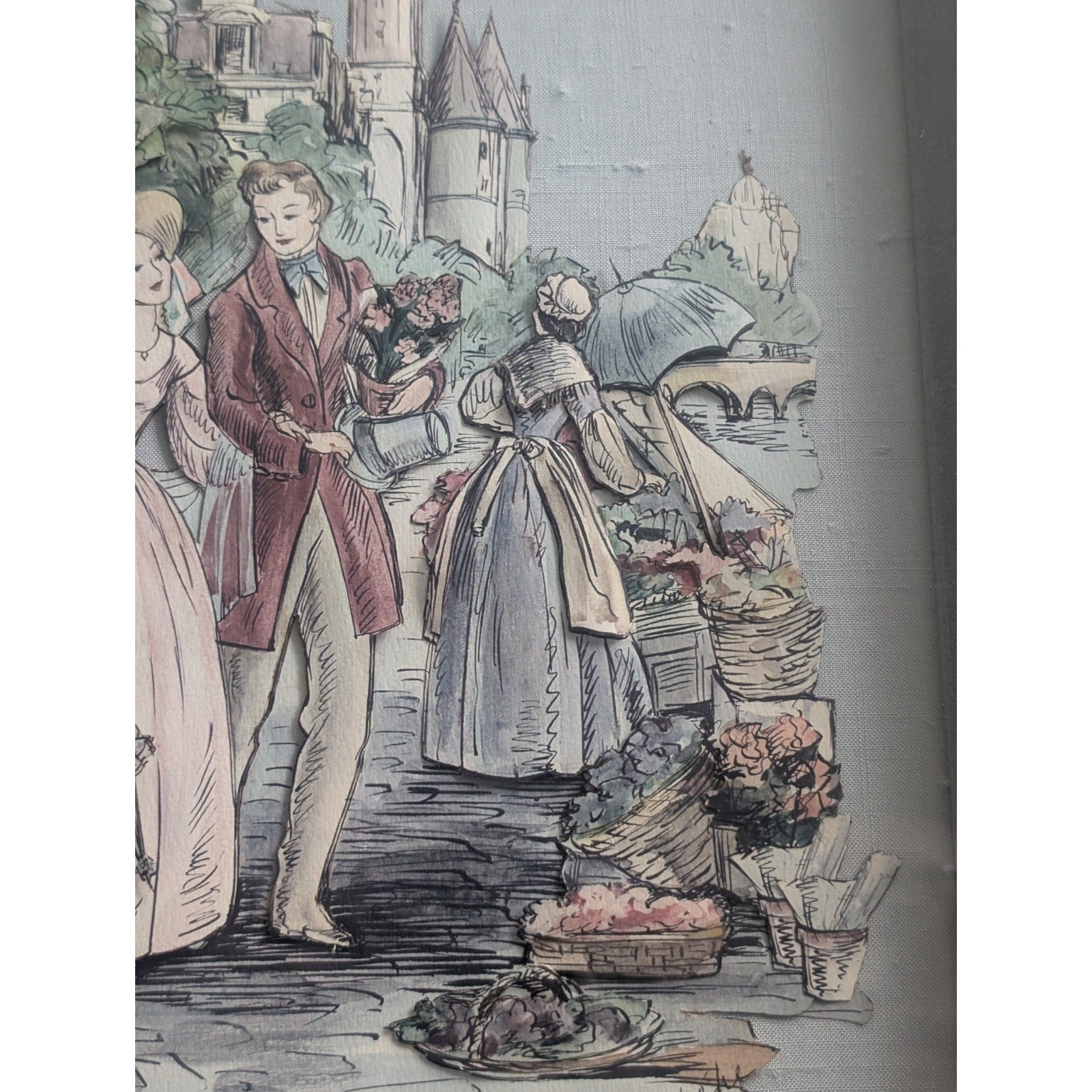 3D paper tole shadow box artwork, signature print? by "Le Pépe". Featuring a charming romantic street scene with a strolling couple, a flower vendor, and classic European architecture in the background, the layered paper design creates depth and dimension. Delicate hand-painted details and quilled paper flowers add an extra touch of artistry.