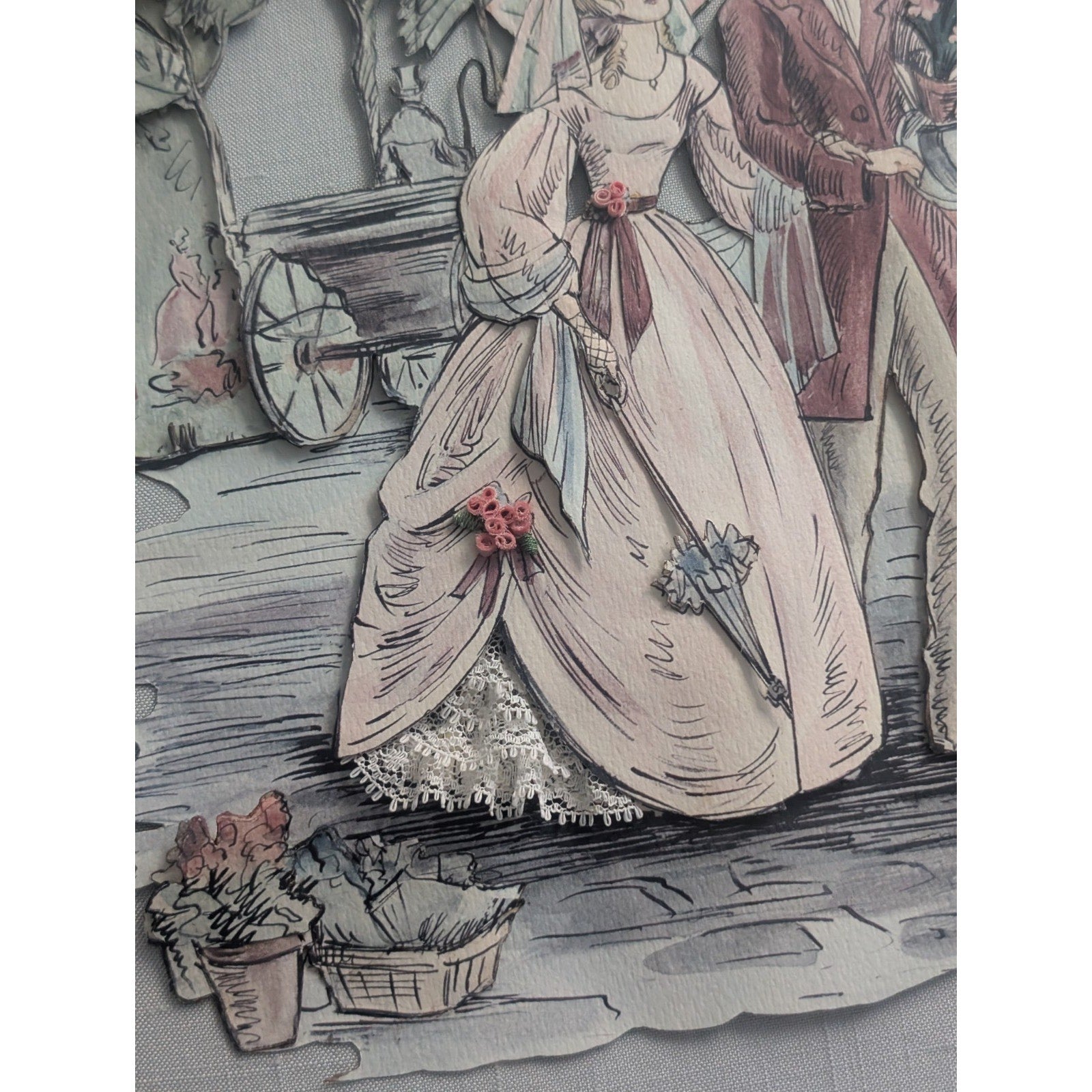 vintage paper tole art, Lupette 3D artwork, shadow box romantic scene, quilled flower art, European street scene, vintage wall decor, mid-century decoupage, framed dimensional art