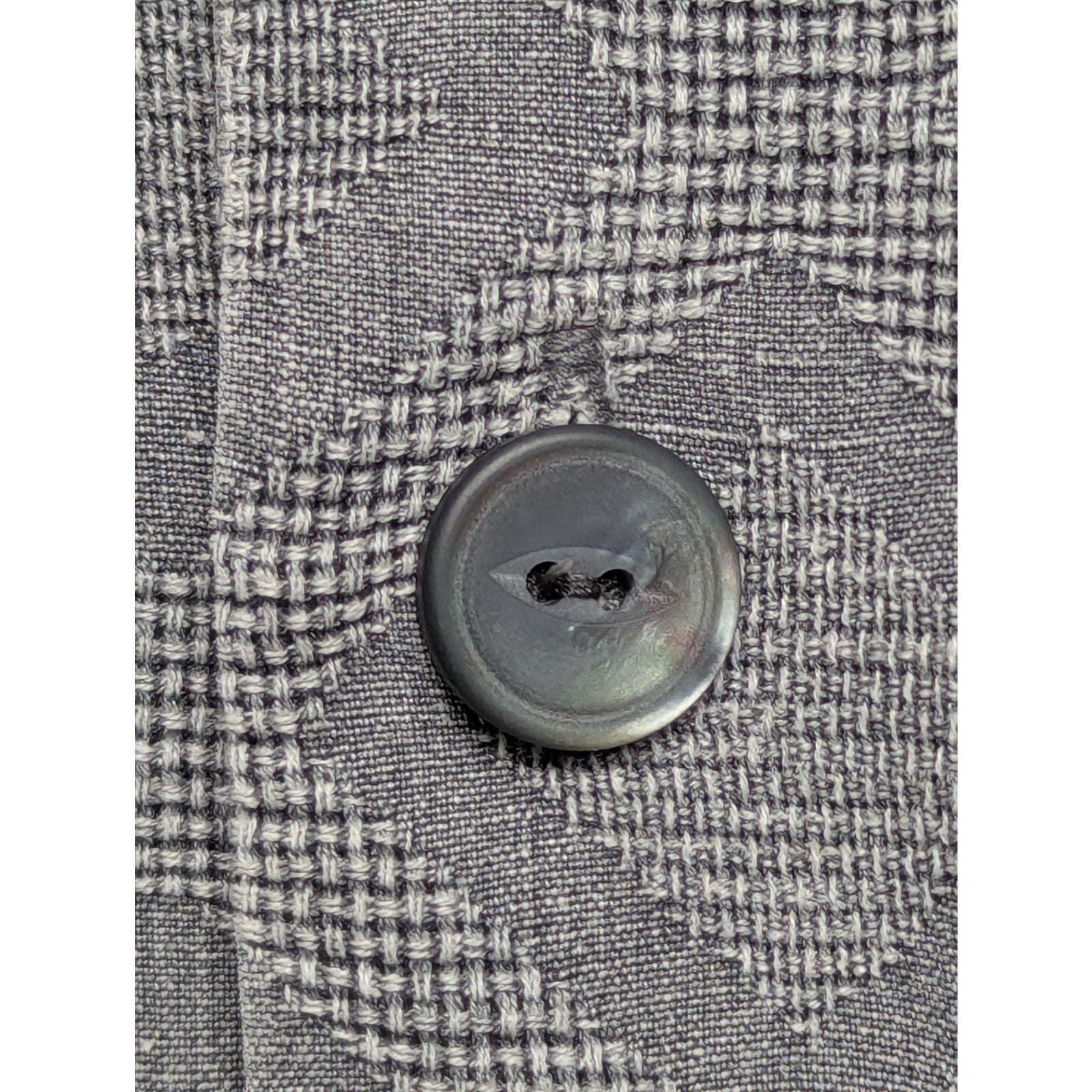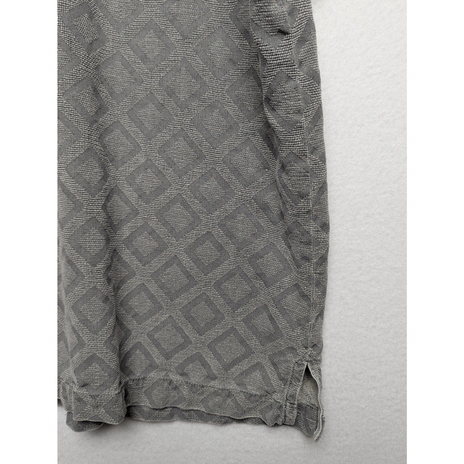 Featuring a subtle diamond jacquard pattern in a smoky gray tone. Size Large. Lightweight and breathable with a relaxed camp collar, chest pocket, and signature island-style vibe.