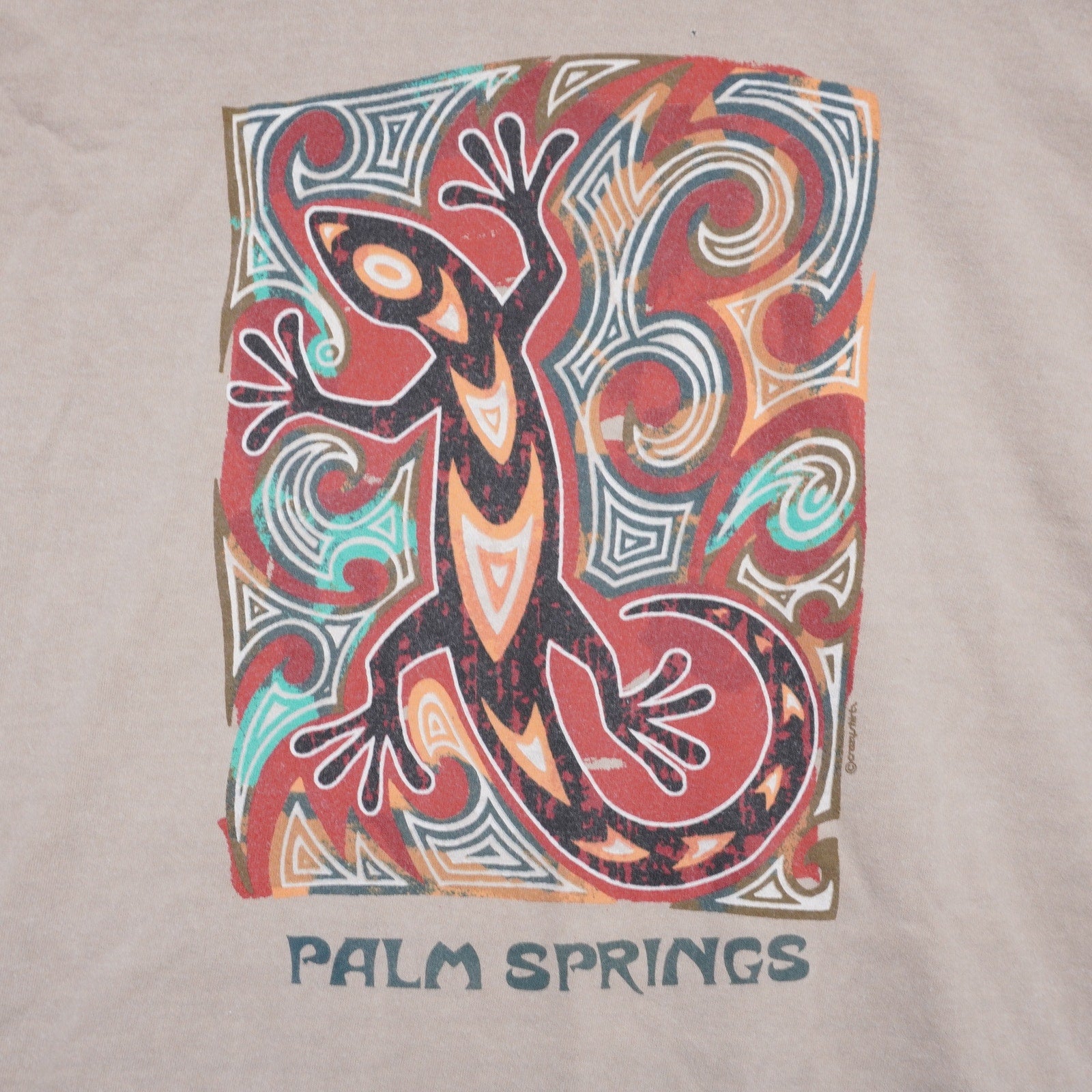 Long sleeve tee with tribal style artwork including a gecko graphic on back with "Palm Springs"
