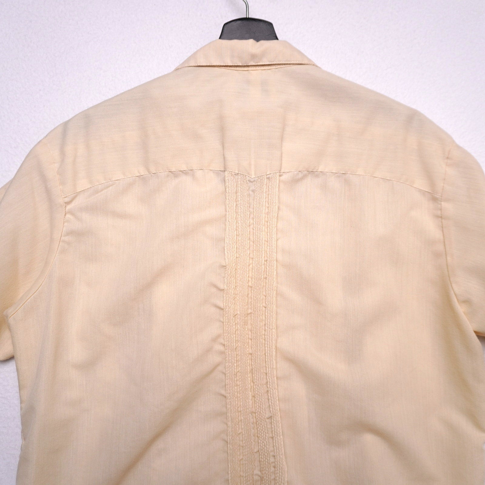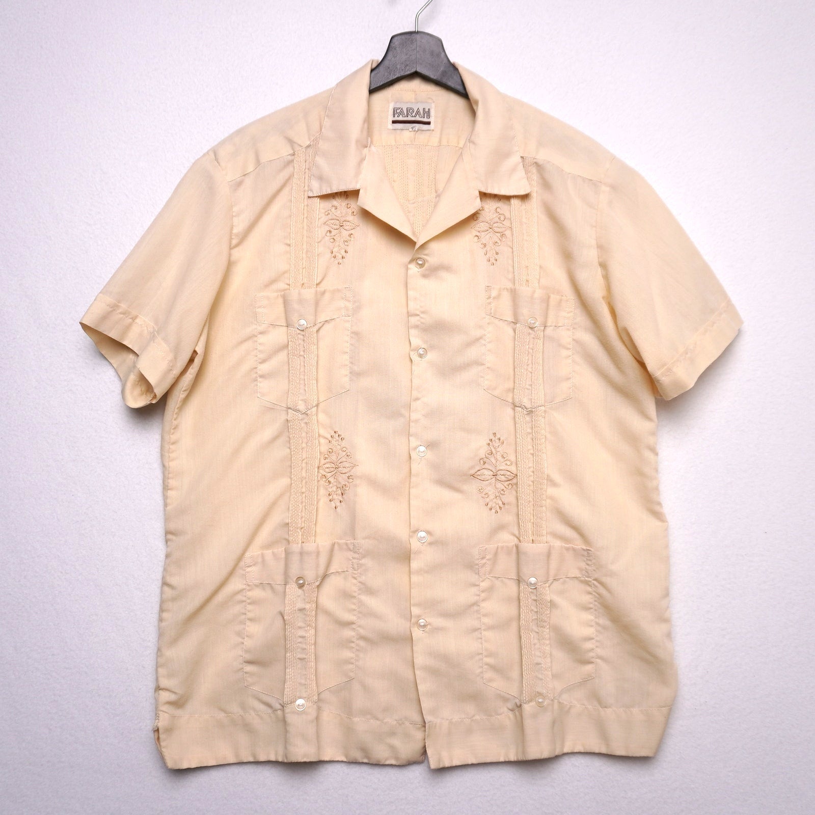 Keywords: Vintage Guayabera, Farah Shirt, Cuban Style Shirt, Beige Tan Shirt, Embroidered Shirt, Mexican Shirt, Summer Resort Wear, Vacation Shirt, Men’s Large, Retro 70s 80s Vibes
