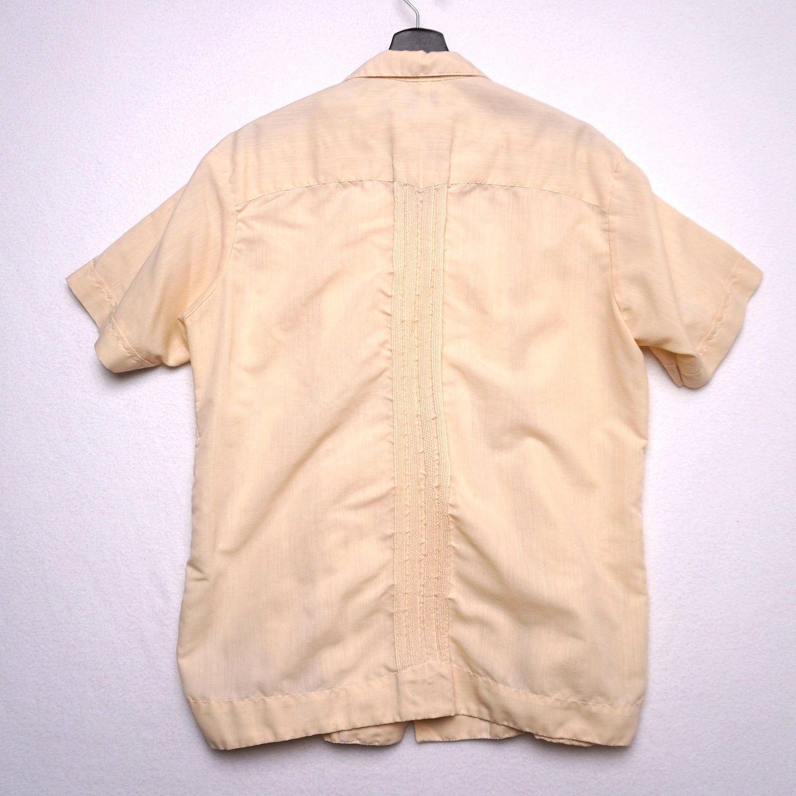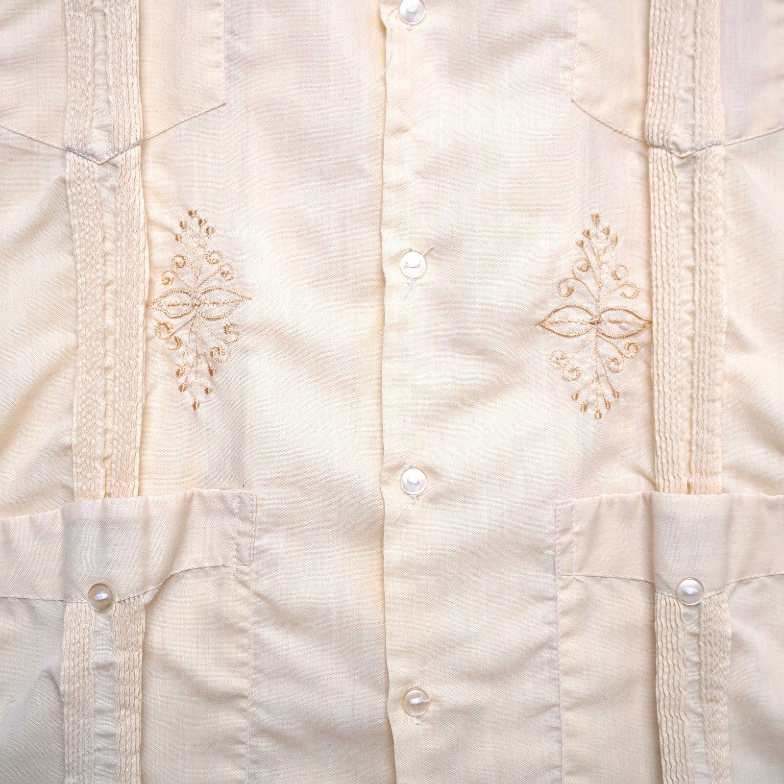 Classic vintage Guayabera shirt with traditional embroidered detailing, pleats, and four-pocket design
