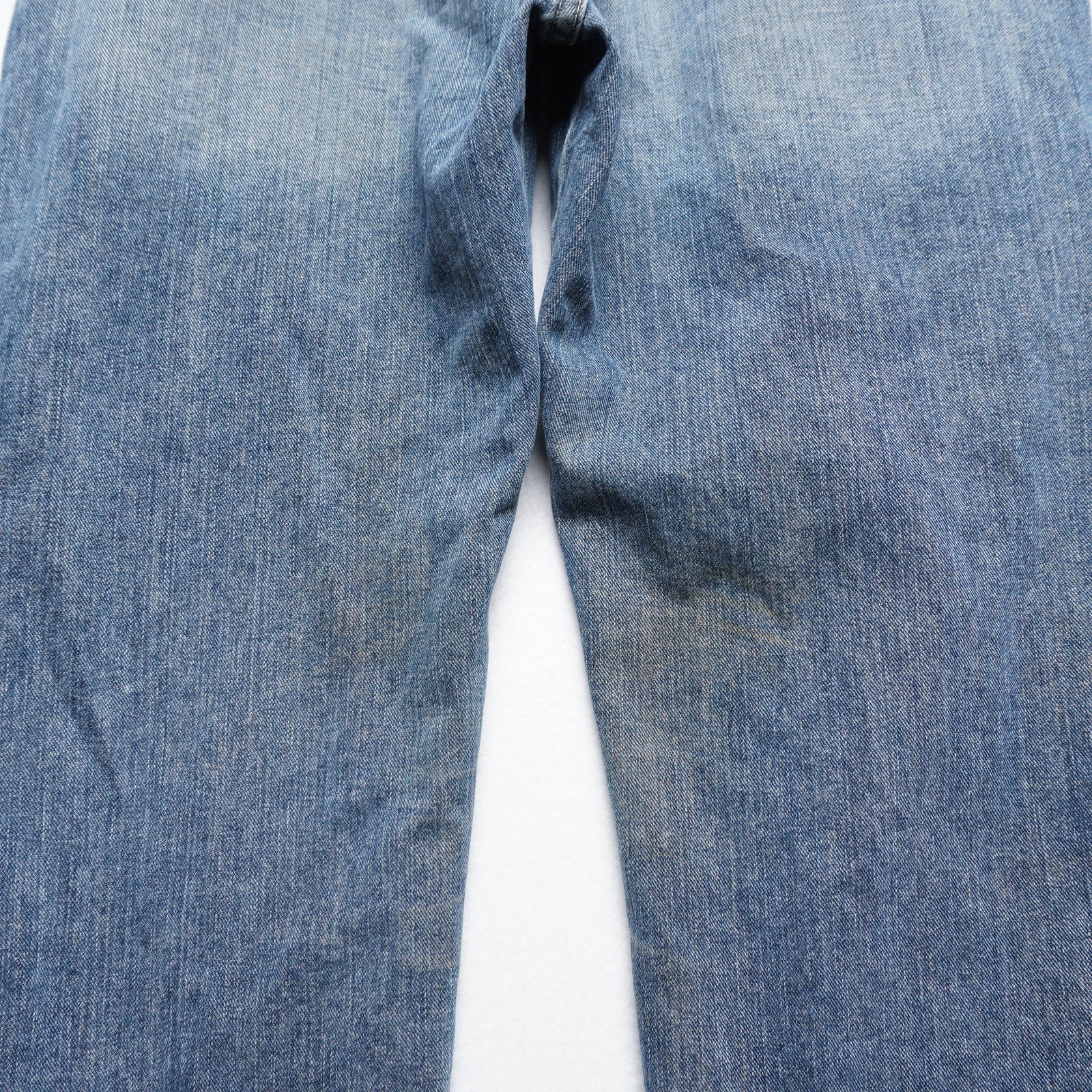 Condition: Good worn-in vintage condition with softening and light whiskering. Some stains visible near inside/back of knees.